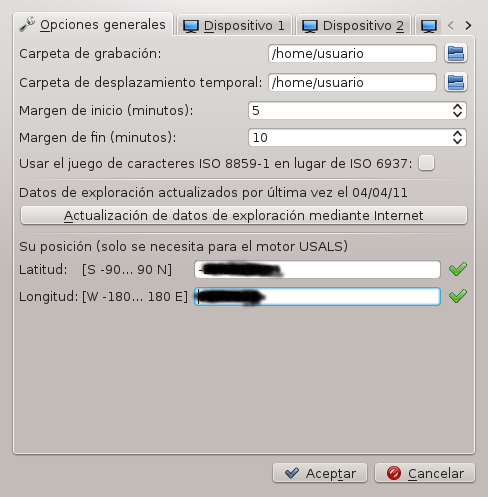 Lo primero que tenemos que hacer es habilitar la opción en la configuración. Esto me resultó un tanto extraño ya que por defecto no se puede realizar desde la interfaz gráfica de kaffeine, sino que primero hay que agregar nuestra posición geográfica en el archivo ~/.kde/share/config/kaffeinerc, en la sección [DVB], opciones Latitude y Longitude.