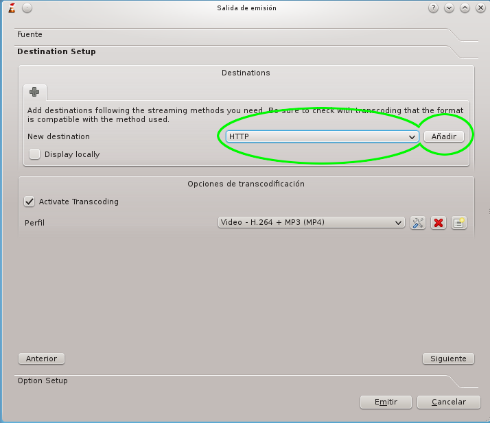 para pasar a elegir las opciones de emisión. En el desplegable optamos por HTTP (aunque hay varias opciones y tal vez mejores formas para hacerlo) y hacemos click en "Añadir"